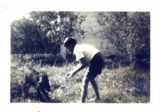 Walter in the pig’s playpen, urging it to play (1941).