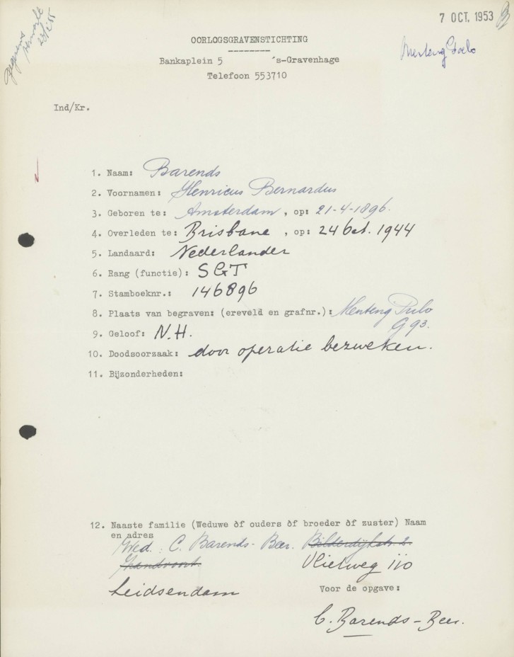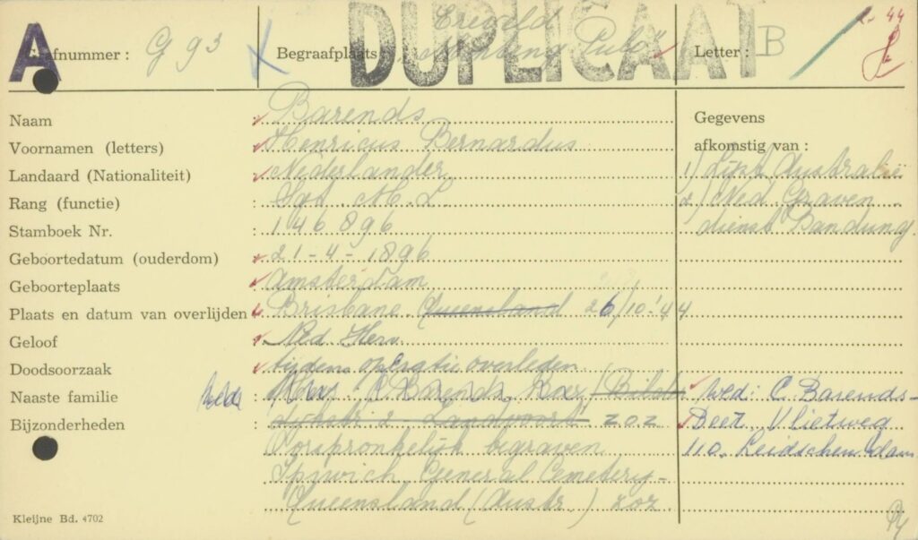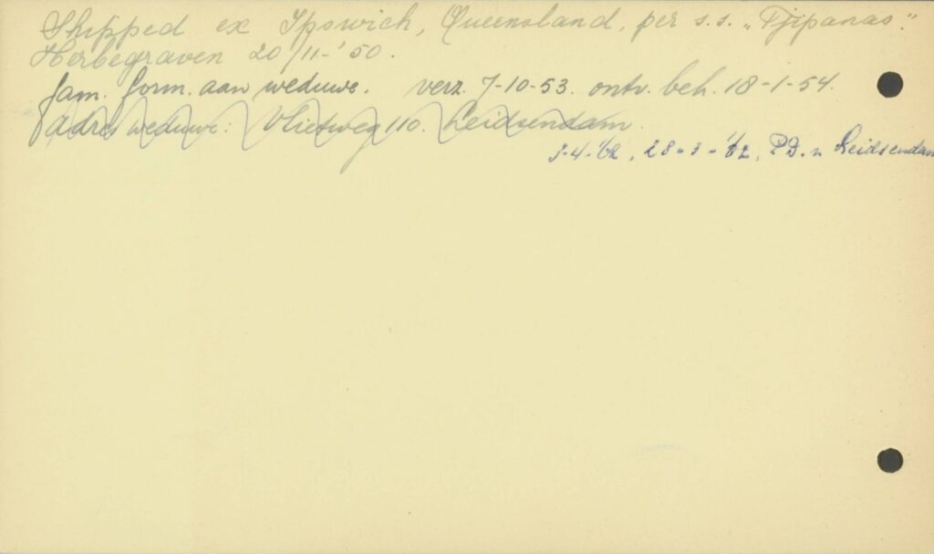 Dutch archival notes confirm that all three Dutch war dead once listed at Ipswich were later transferred to Indonesia by the KNIL Military Graves Service and reinterred at Menteng Pulo. The men were: